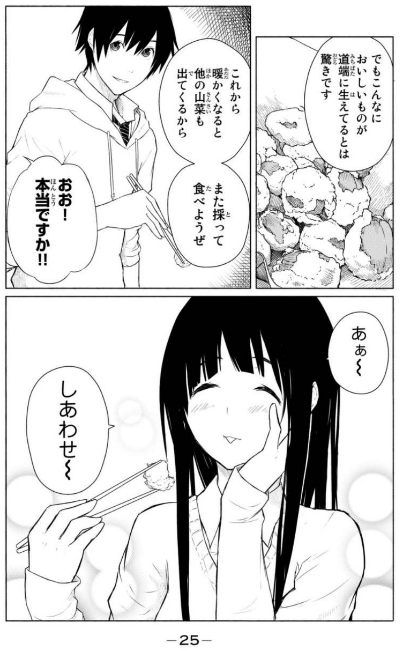 スローライフのお話は、例えば「下校帰りに採った山菜を天ぷらで揚げて食べる1話」。「これで1話使うのか…」と思うくらい、ゆったりとしたペースで進みます。日常系漫画を楽しみたい方にとっては、刺さること間違いないでしょう。